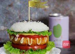 19.接着放上一片西红柿片、芝士片、生菜,最后把涂抹番茄酱的米饭团盖上,撒少许黑芝麻装饰。